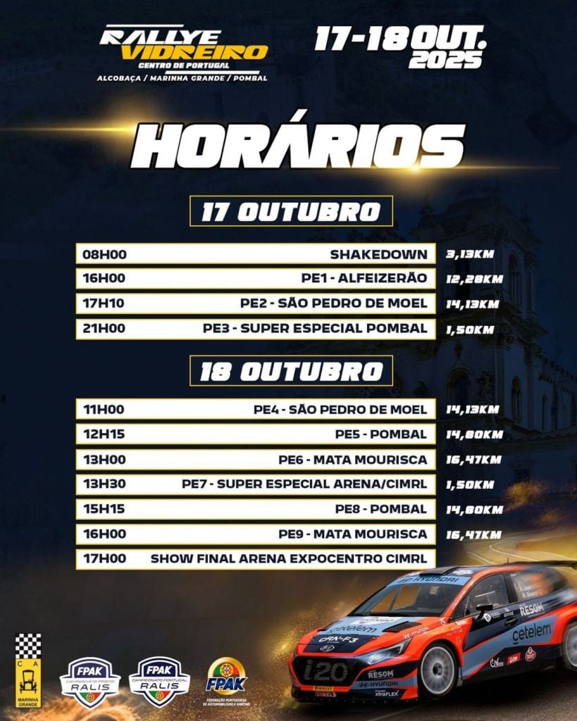 Nos dias 17 e 18 de outubro, o Rallye Vidreiro – Centro de Portugal volta a acelerar pelas estradas dos concelhos de Alcobaça, Marinha Grande e Pombal, levando consigo a emoção, o espetáculo e o som inconfundível dos motores. A prova, organizada pelo Clube Automóvel da Marinha Grande, encerra o Campeonato de Portugal de Ralis (CPR) e promete ser uma das edições mais intensas dos últimos anos.